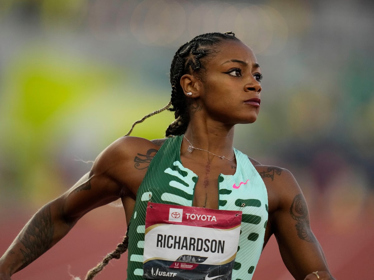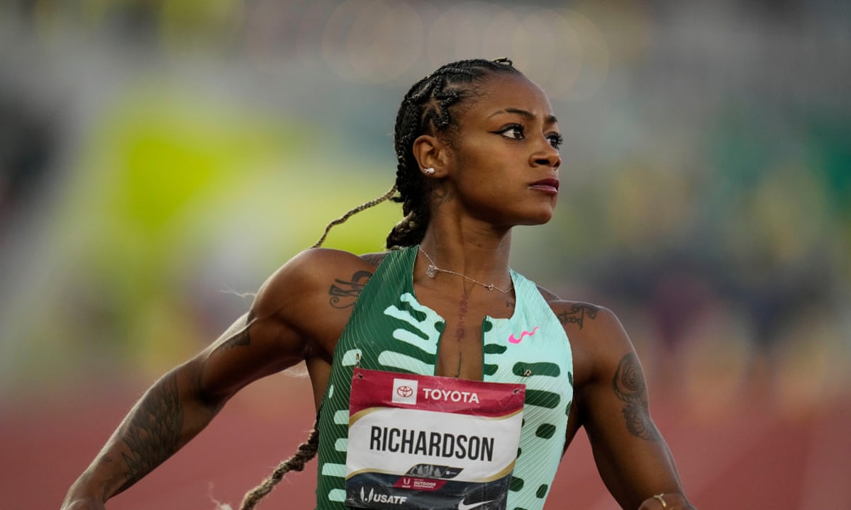 Source : www.theguardian.comSha’Carri Richardson tosses her orange wig before winning race